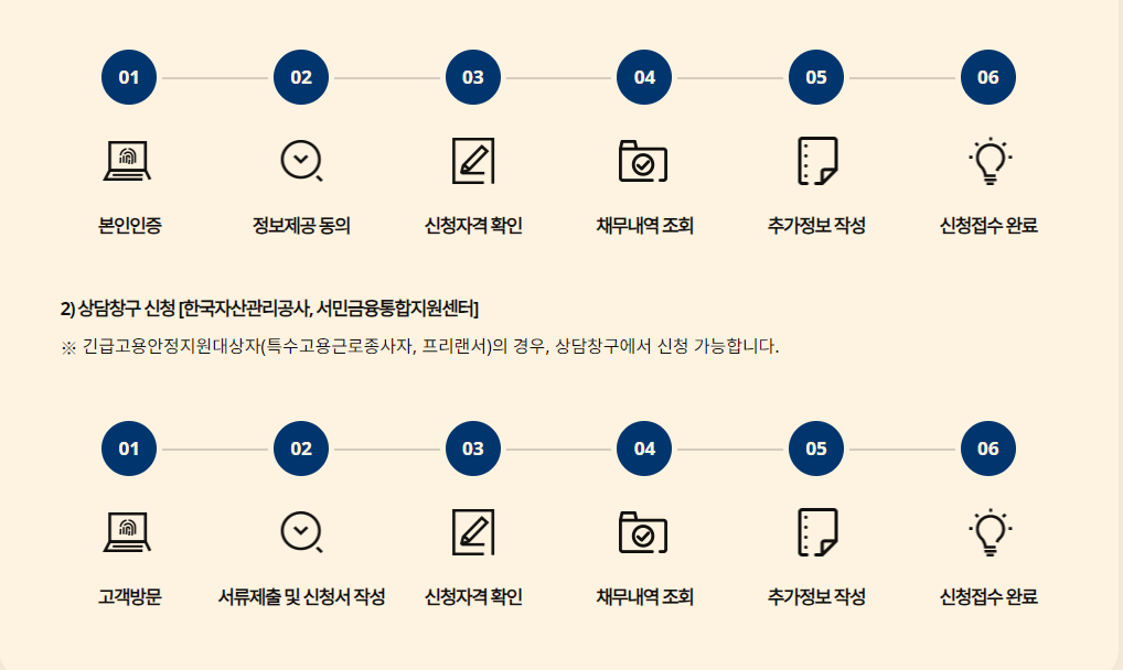 ♣ 본인인증 → 정보제공 동의 → 신청자격 확인 → 채무내역 조회 → 추가정보 작성 → 신청접수 완료